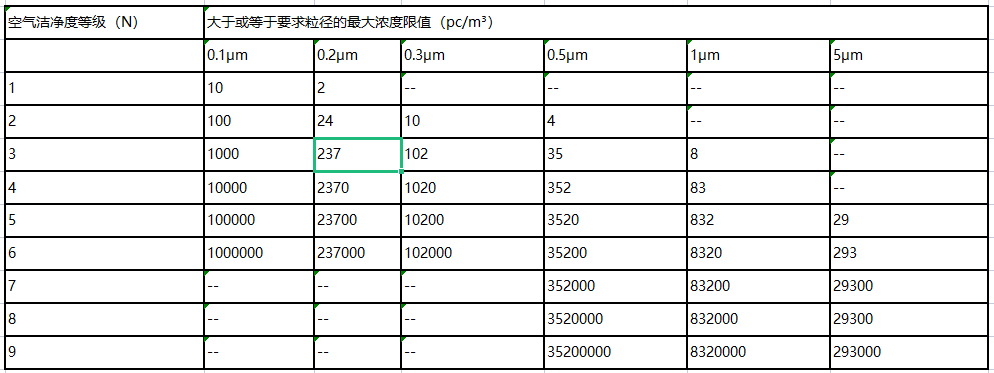 5 、 電子工業(yè)潔凈室空氣潔凈度等級(jí)表 :